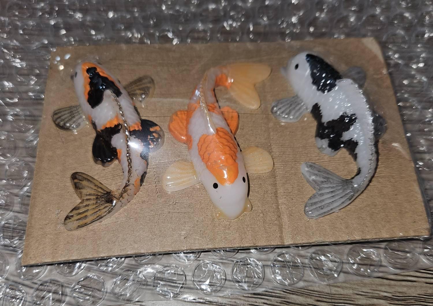 ✦ Set of 3 resin koi fish in your choice of colors (black/white, orange/white, or tricolor).