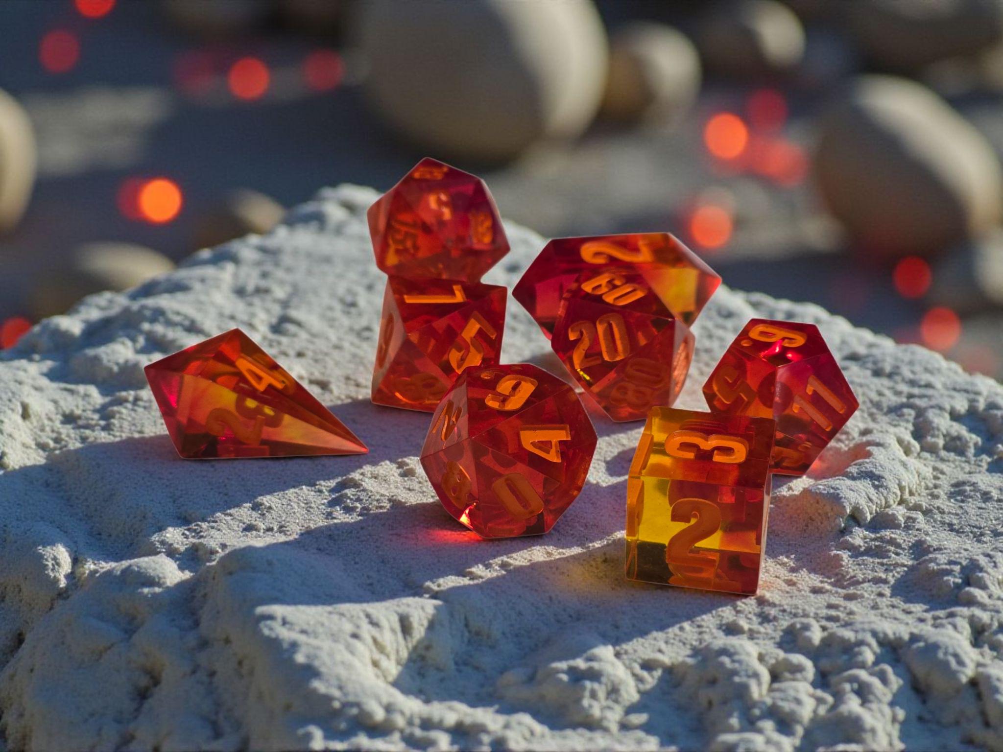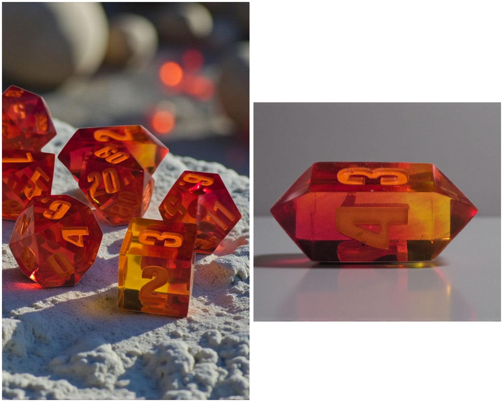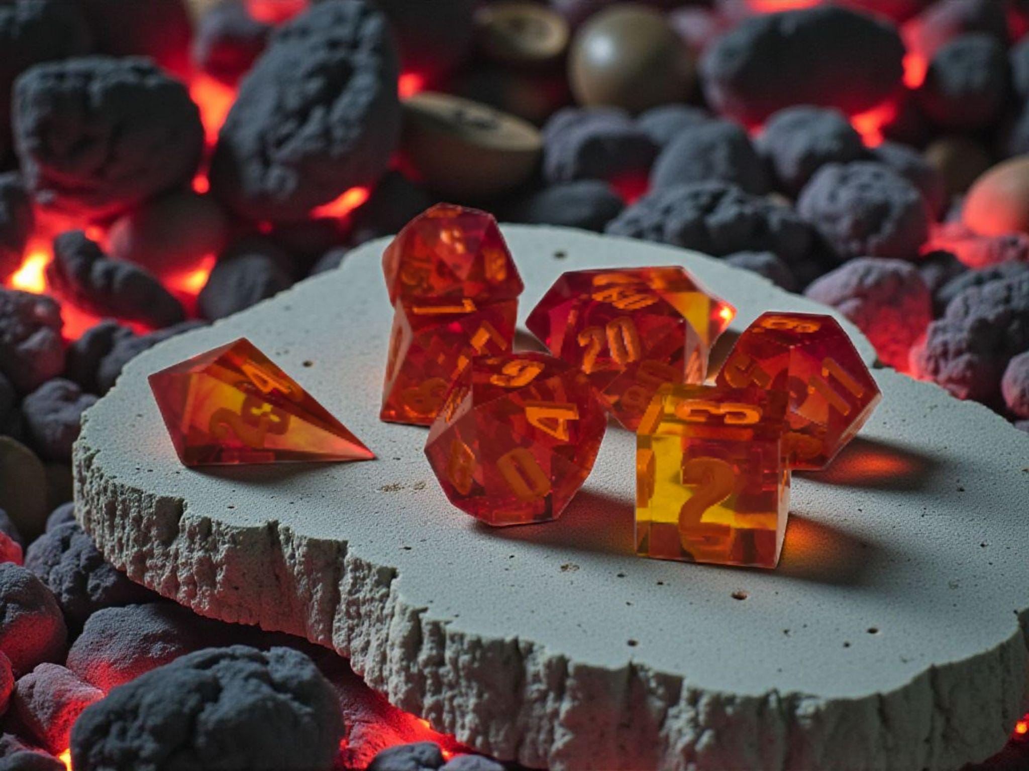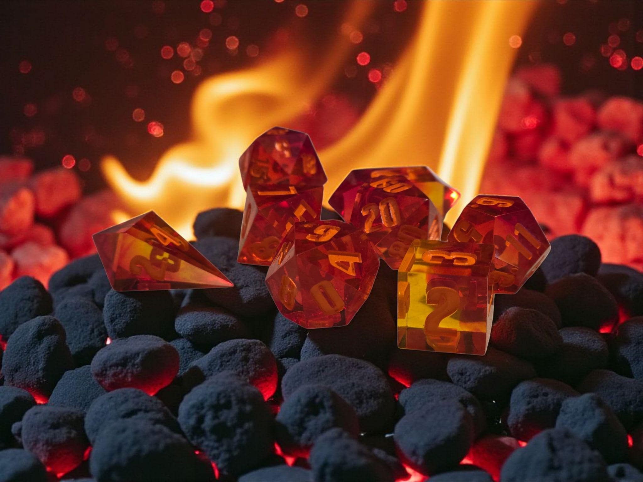 Forged beneath the crimson veil where flame and oath intertwine, Oath of the Veilfire burns with the essence of sacred promise. Each die glows like a molten relic drawn from the heart of an eternal forge — a tribute to vows once spoken before ancient pyres. Their translucent ember hue captures the dance between fire and faith, flickering with power as though whispered prayers to the flame linger within.