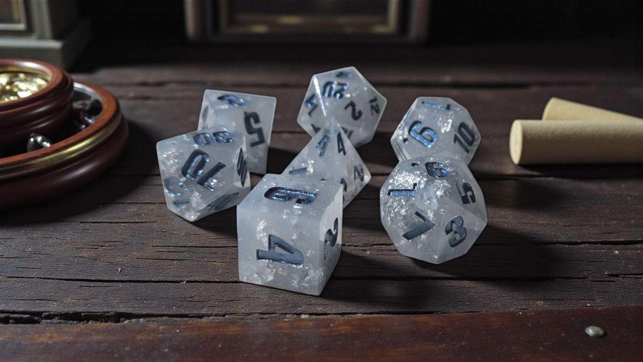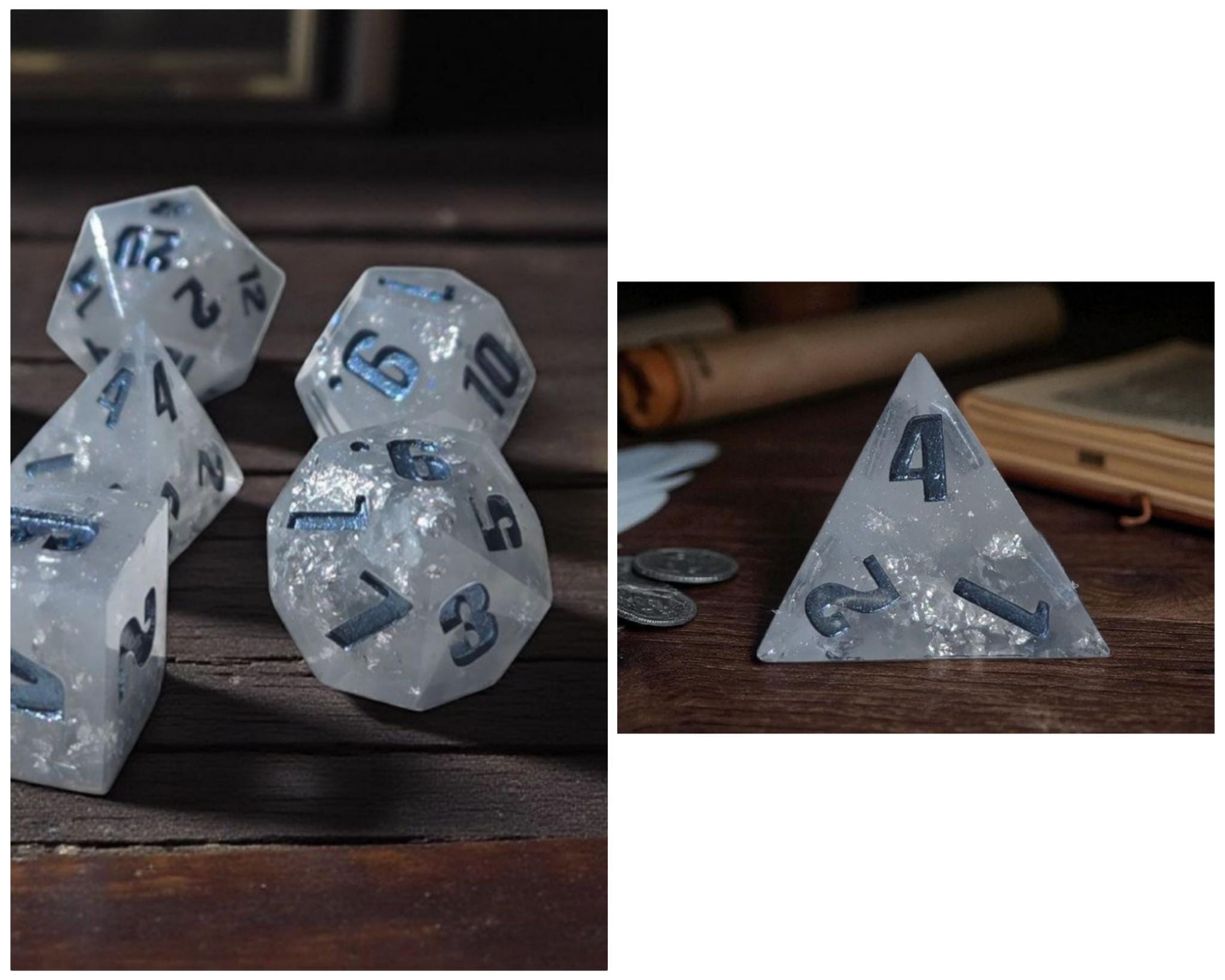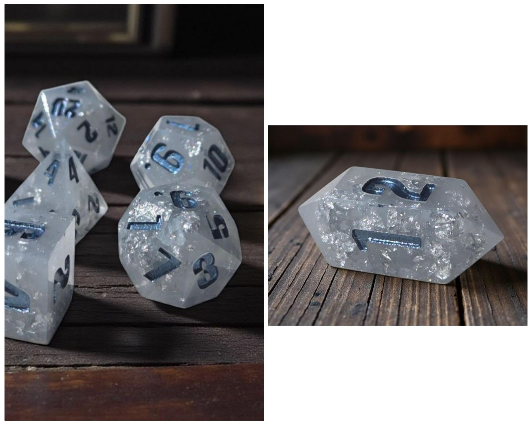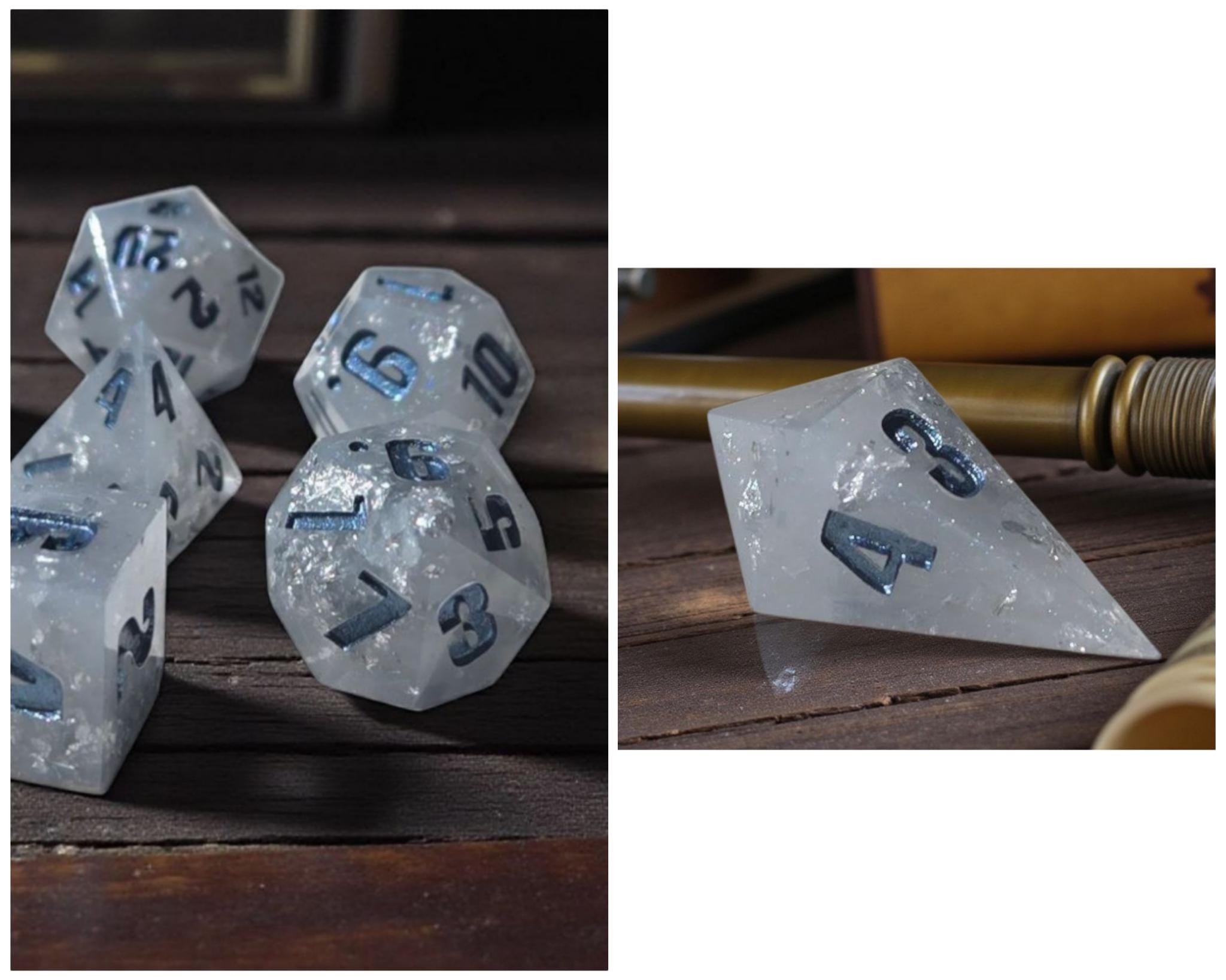 ✦ 7-piece sharp-edge resin dice set infused with silver flakes for a storm-touched look