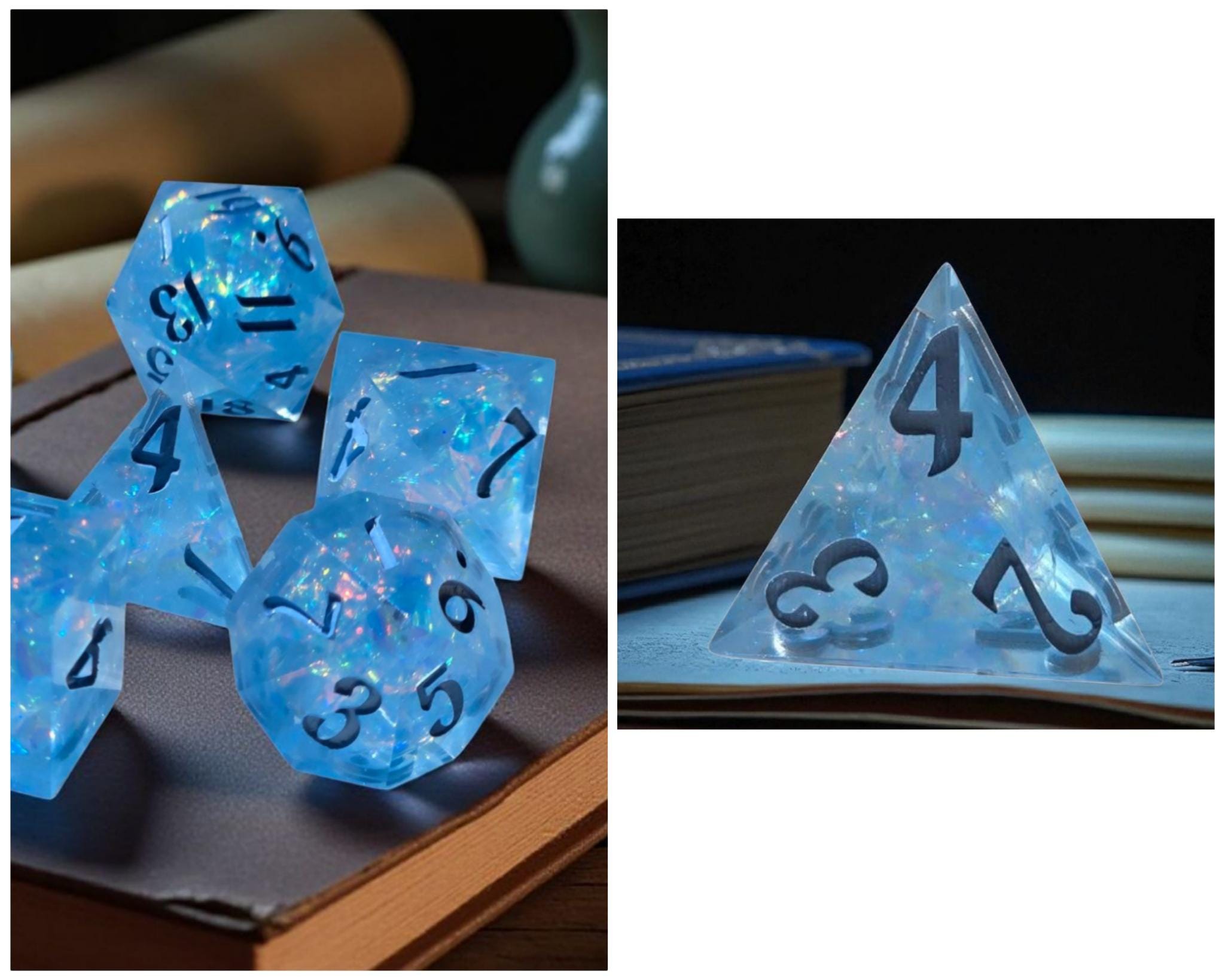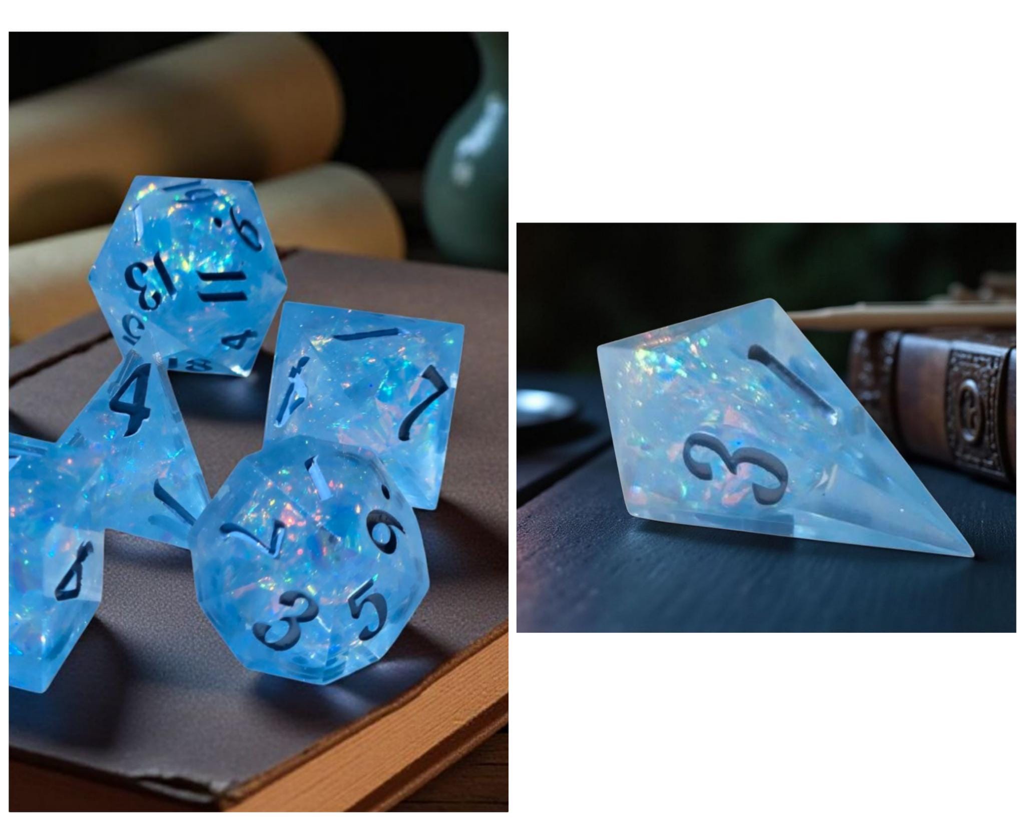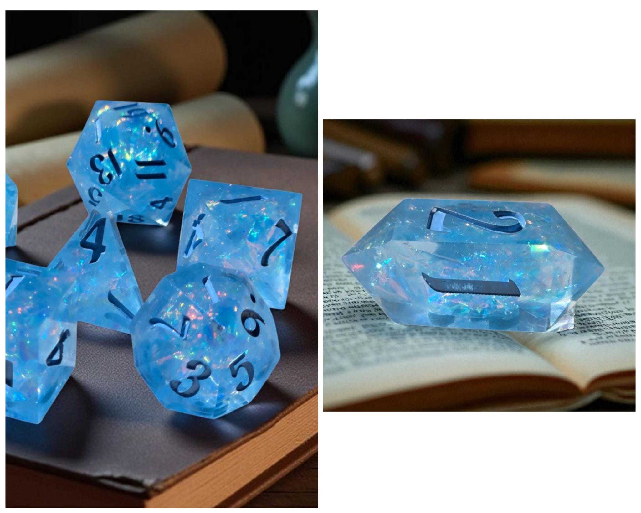 Shattered fragments of moonlight, captured in crystal form—this set shimmers with the ethereal glow of a midnight sky. The Blue Moon Shards Dice Set glimmers with shifting iridescence, as though starlight and lunar magic were woven into every facet. When rolled, they carry the mystery of the cosmos, guiding heroes and wanderers through realms both arcane and unknown.