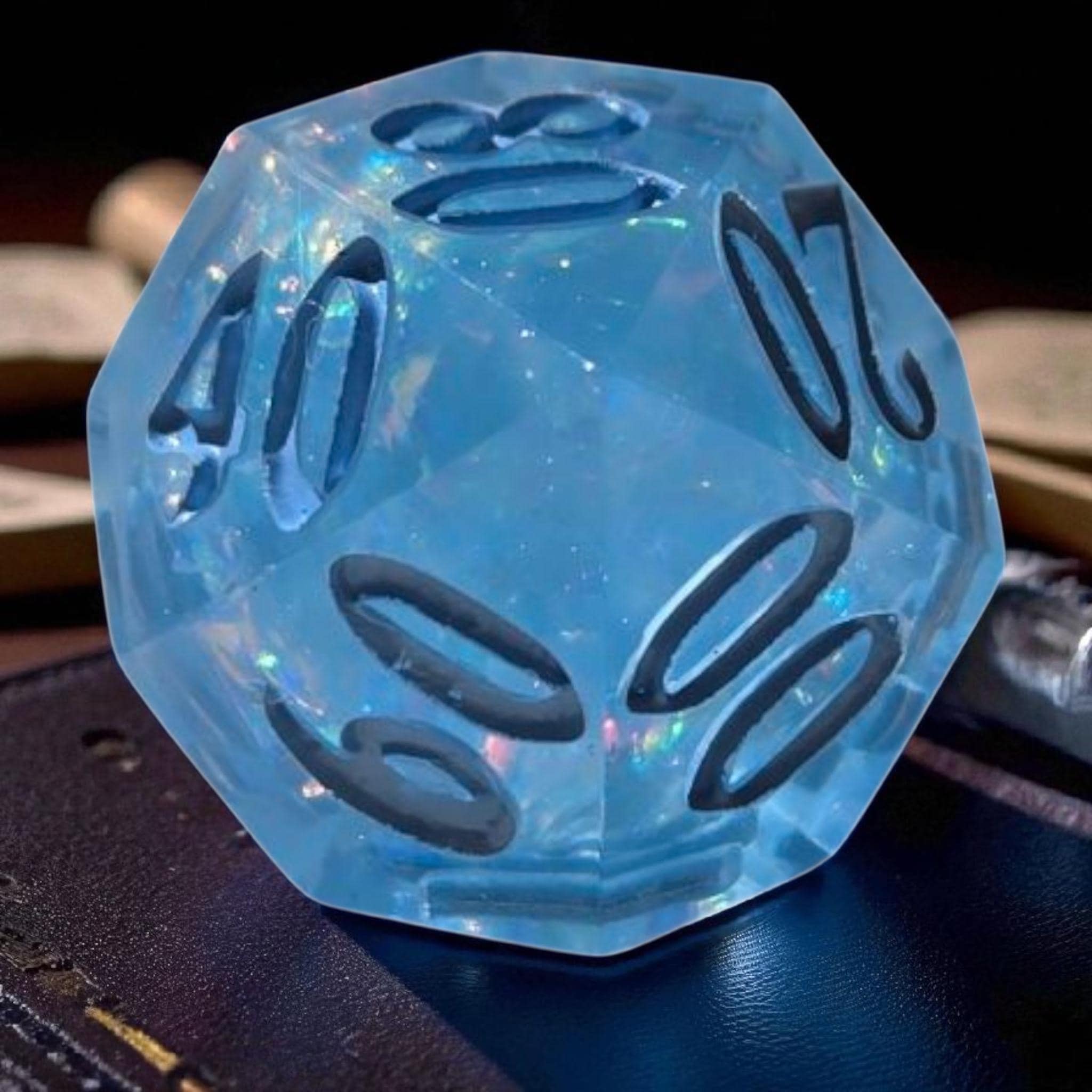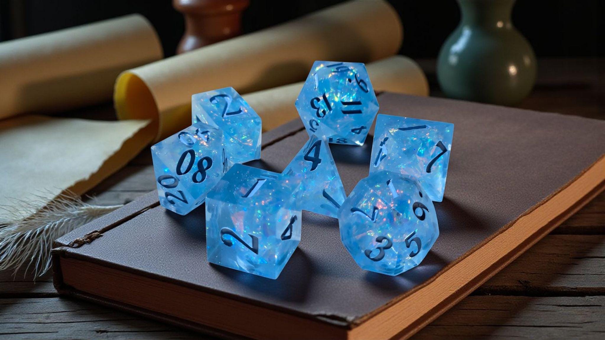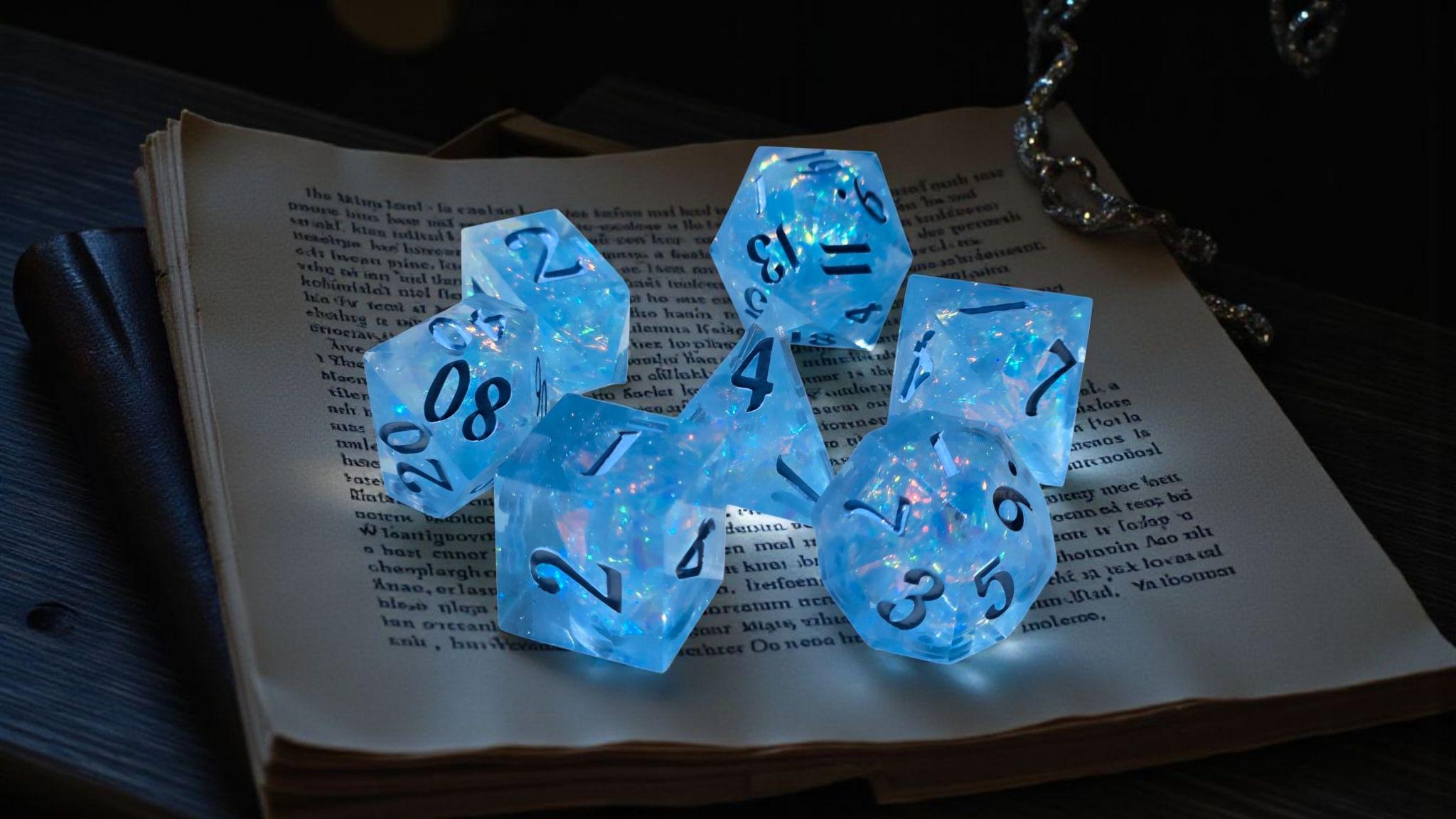 Shattered fragments of moonlight, captured in crystal form—this set shimmers with the ethereal glow of a midnight sky. The Blue Moon Shards Dice Set glimmers with shifting iridescence, as though starlight and lunar magic were woven into every facet. When rolled, they carry the mystery of the cosmos, guiding heroes and wanderers through realms both arcane and unknown.
