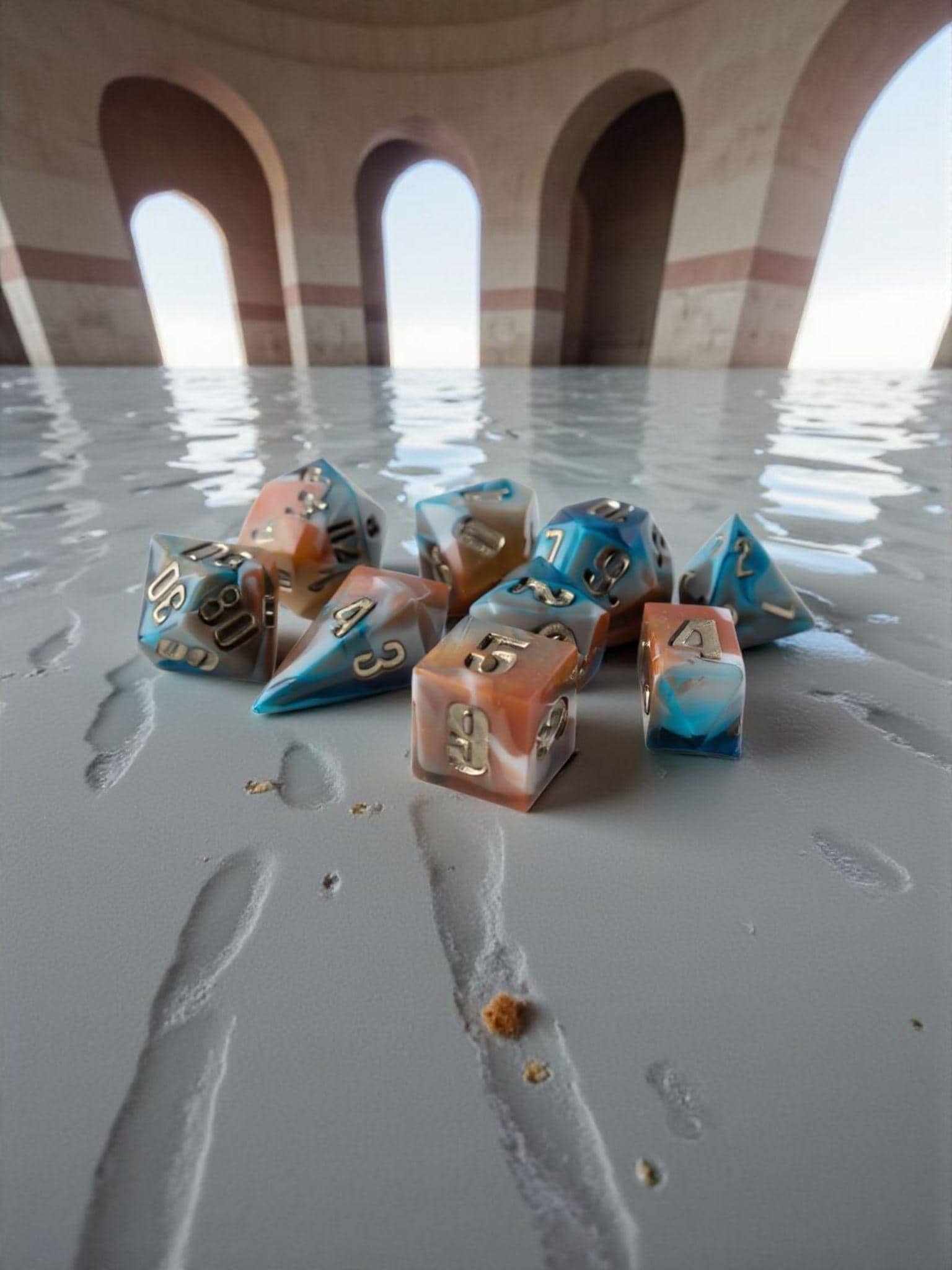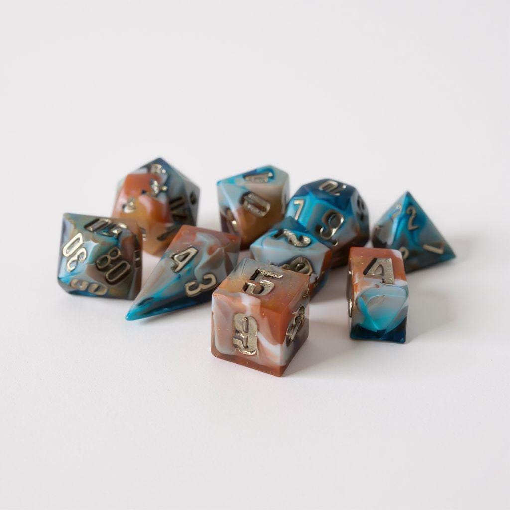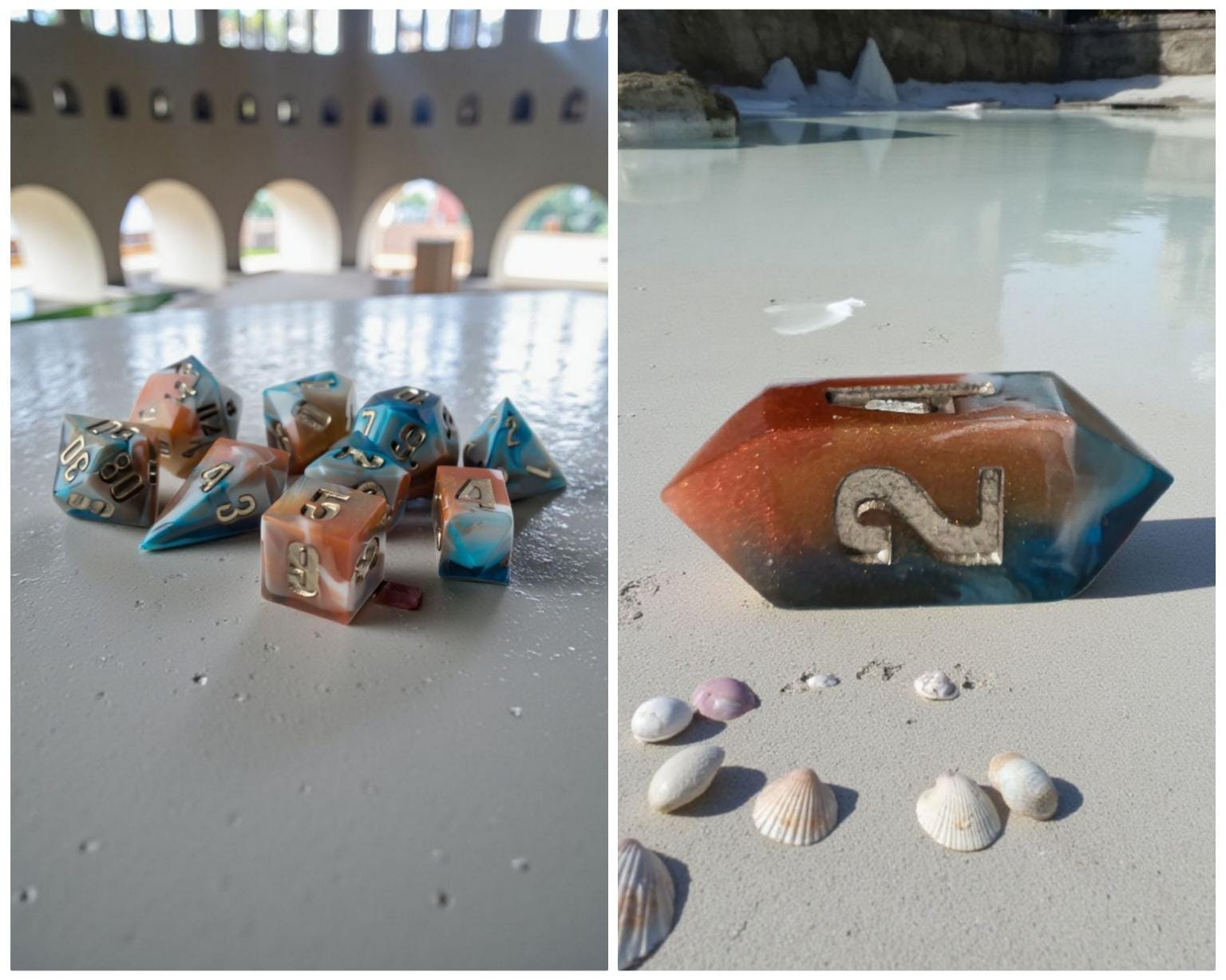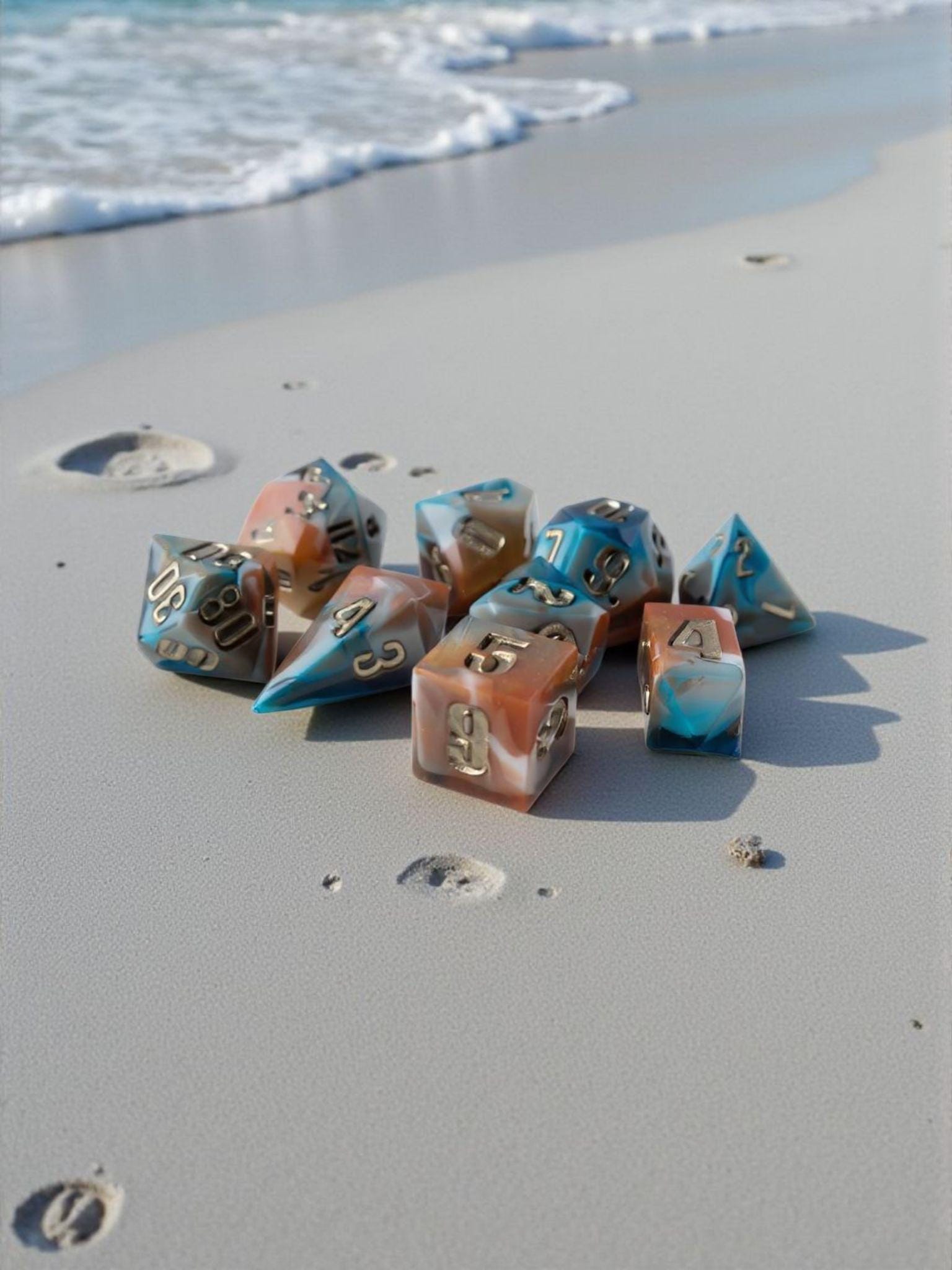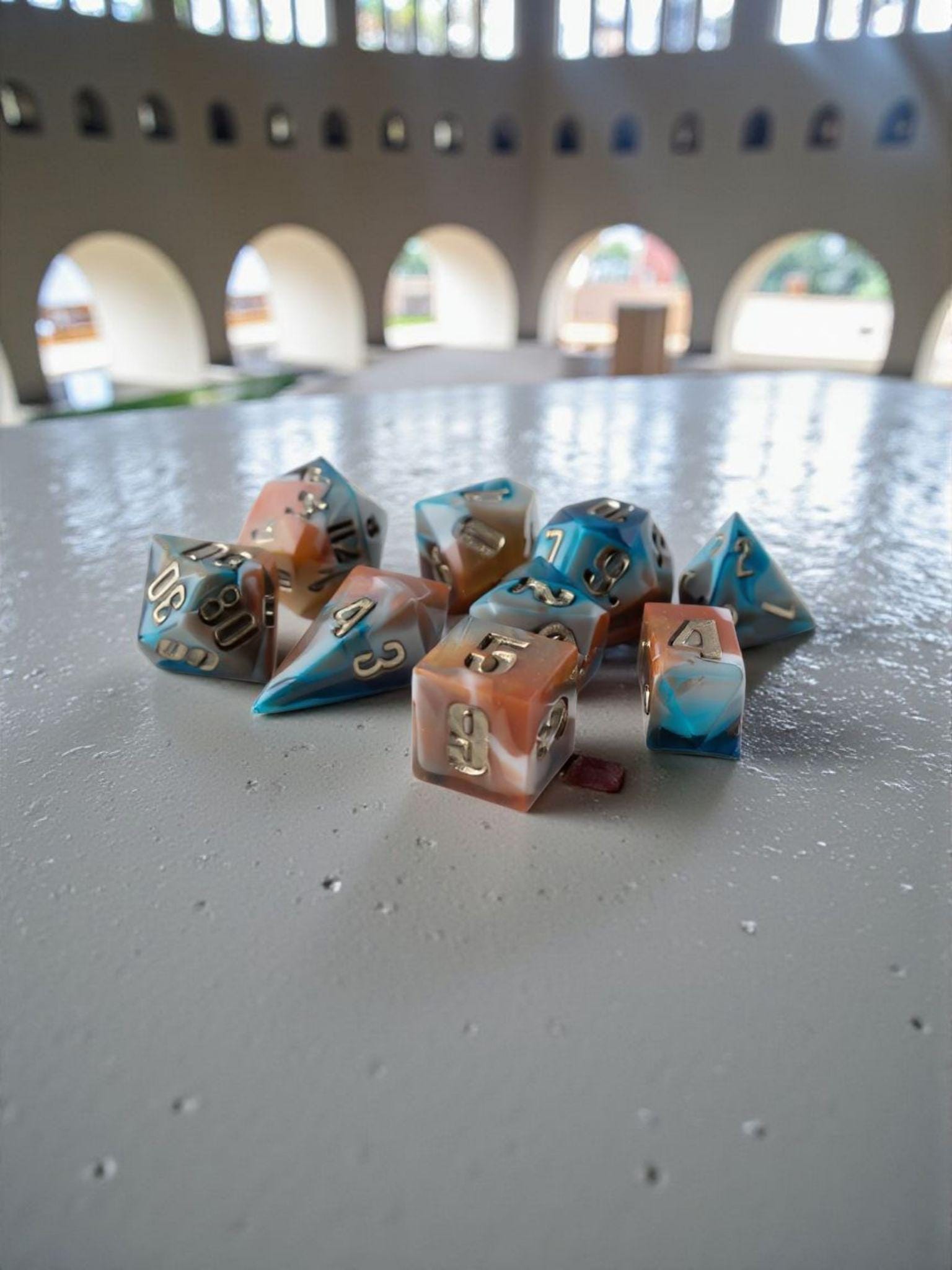 Sculpted from the meeting point of sea-washed coral and shimmering lagoon currents, these dice are said to be relics of the Aqua Veil…that dreamy boundary where mortal shores kiss forgotten kingdoms below. Soft surf-worn orange and tranquil oceanic blue ripple together like sunset over the tide, holding secrets of shipwrecked treasure and siren-sung moonlight. Roll them to summon the bravery of sailors, the cunning of reef-lurkers, and the calm wisdom of ancient tides.
