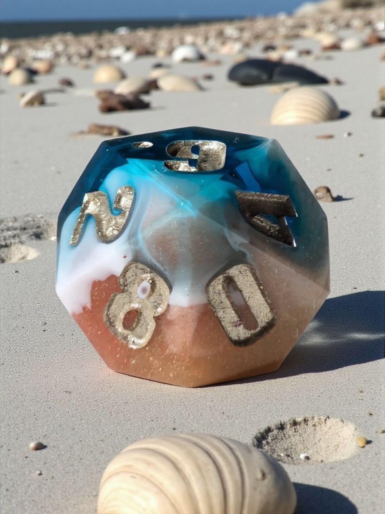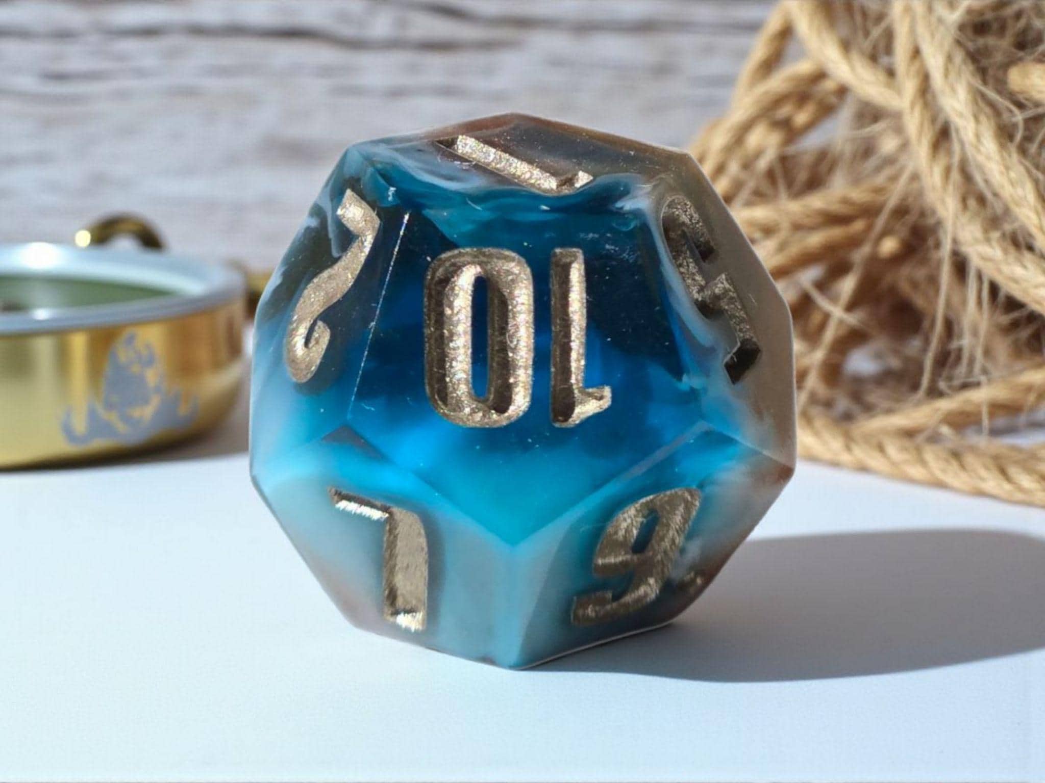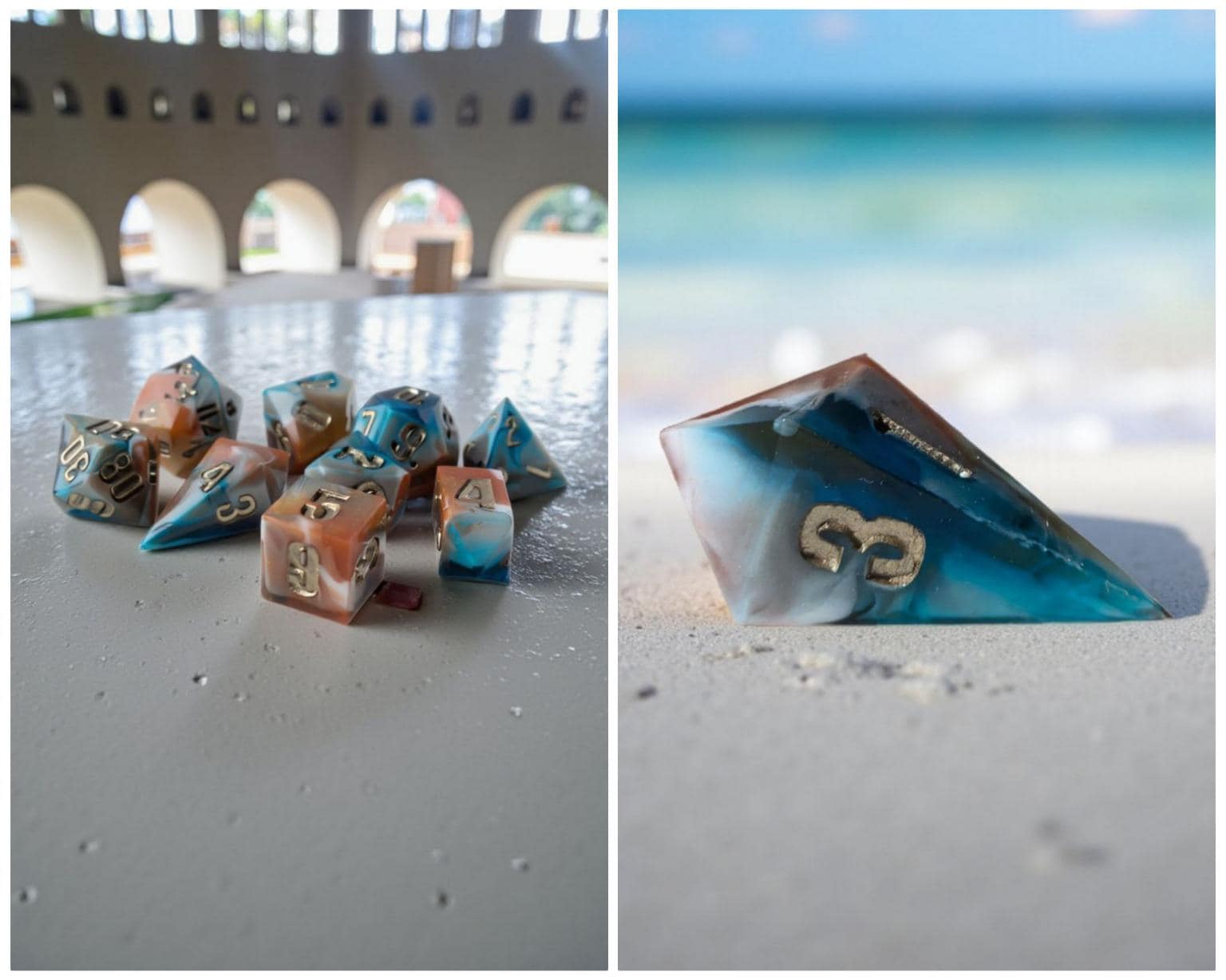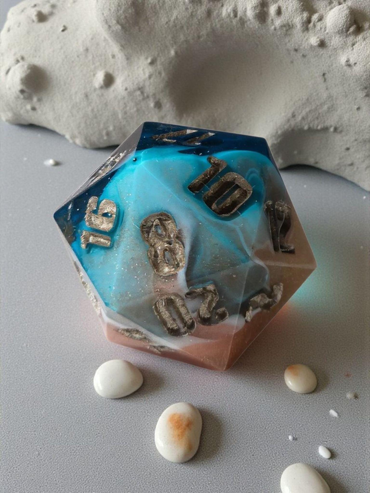 Sculpted from the meeting point of sea-washed coral and shimmering lagoon currents, these dice are said to be relics of the Aqua Veil…that dreamy boundary where mortal shores kiss forgotten kingdoms below. Soft surf-worn orange and tranquil oceanic blue ripple together like sunset over the tide, holding secrets of shipwrecked treasure and siren-sung moonlight. Roll them to summon the bravery of sailors, the cunning of reef-lurkers, and the calm wisdom of ancient tides.