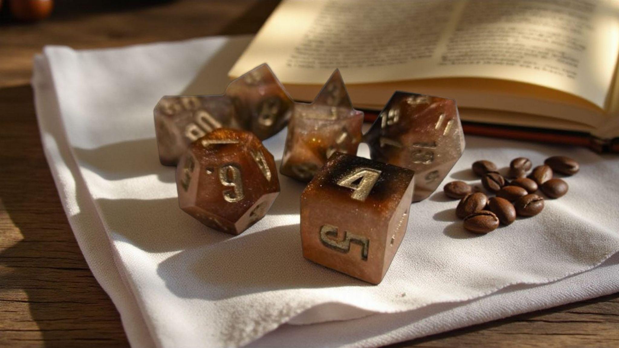 Each die glows with tones of roasted bronze and cream, kissed by sunlight and dusted with faint metallic shimmer — as though steeped in the alchemical heart of the first morning brew.