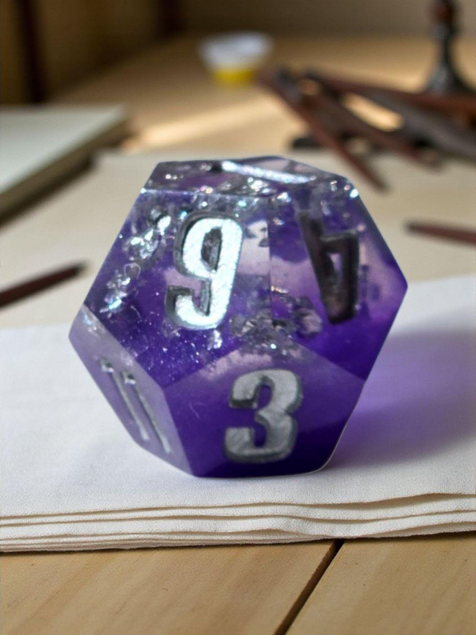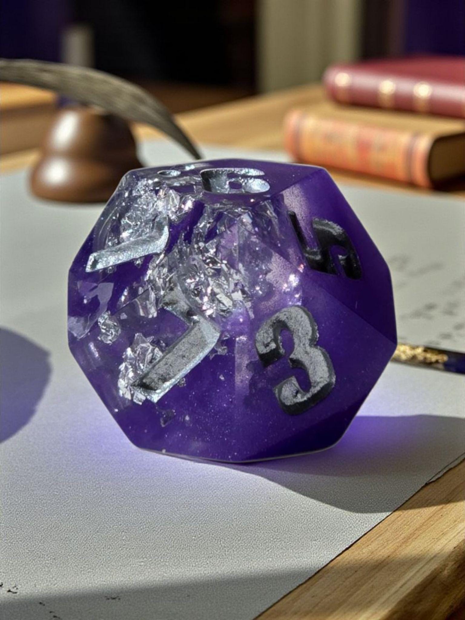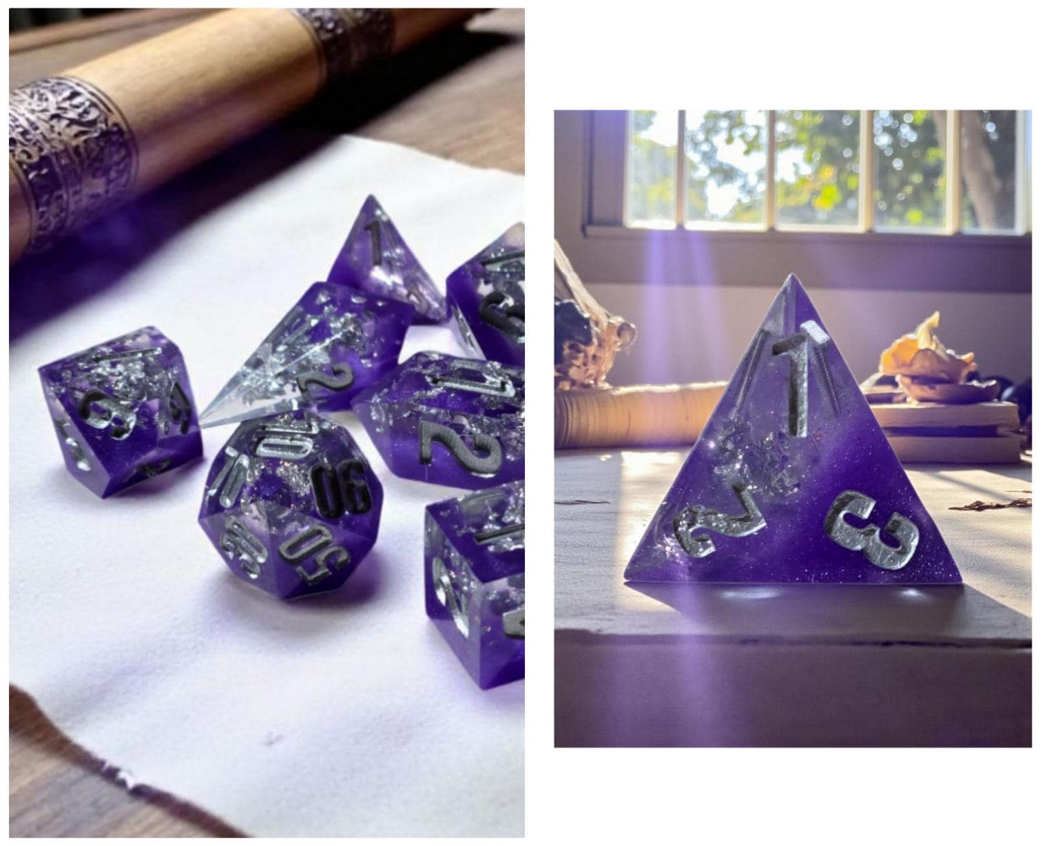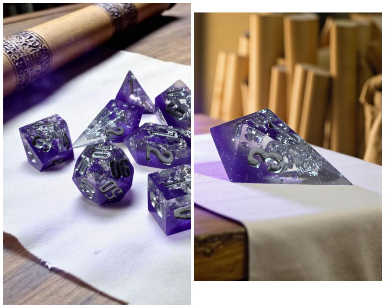 Forged in tranquil aether, the Shards of Serenity shimmer like violet prayers caught in crystal form. Each die captures the moment between stillness and revelation—the hush before divine understanding takes root. Silver leaf inclusions glimmer within the deep violet resin, reminiscent of sacred light refracted through temple glass, their edges honed sharp as consecrated runes.