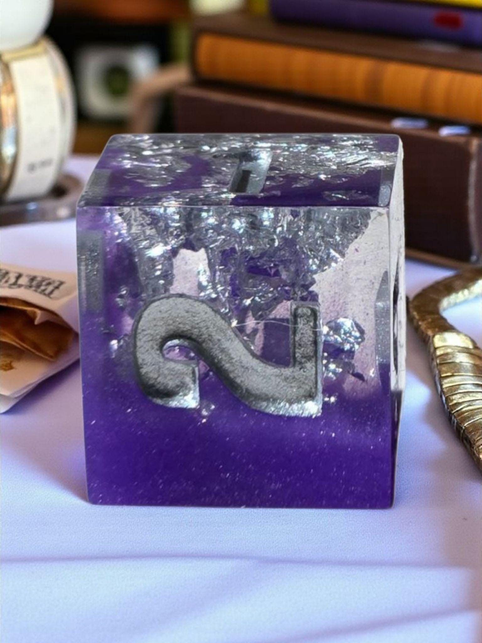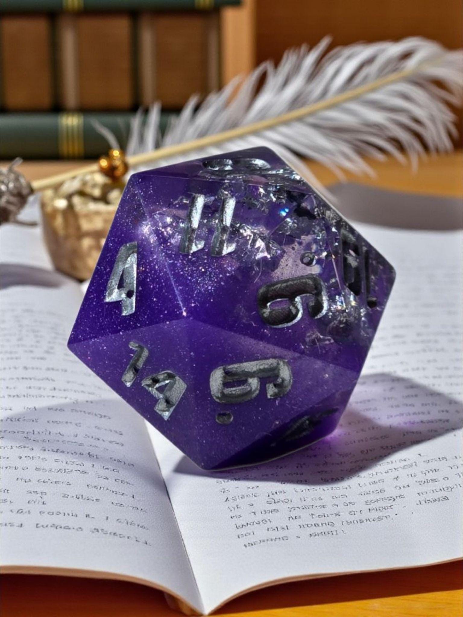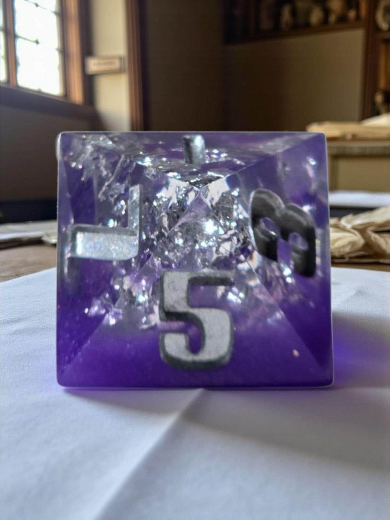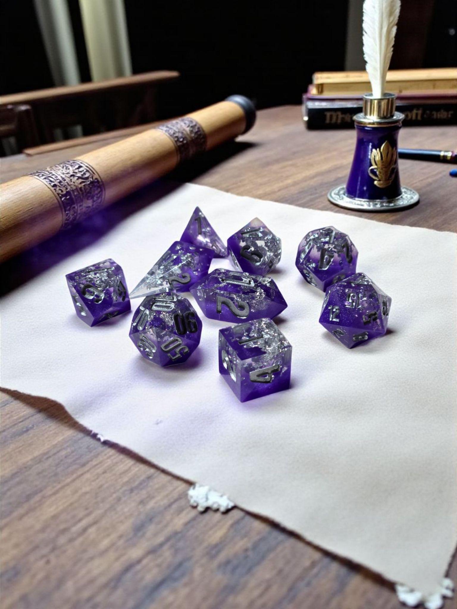 Forged in tranquil aether, the Shards of Serenity shimmer like violet prayers caught in crystal form. Each die captures the moment between stillness and revelation—the hush before divine understanding takes root. Silver leaf inclusions glimmer within the deep violet resin, reminiscent of sacred light refracted through temple glass, their edges honed sharp as consecrated runes.