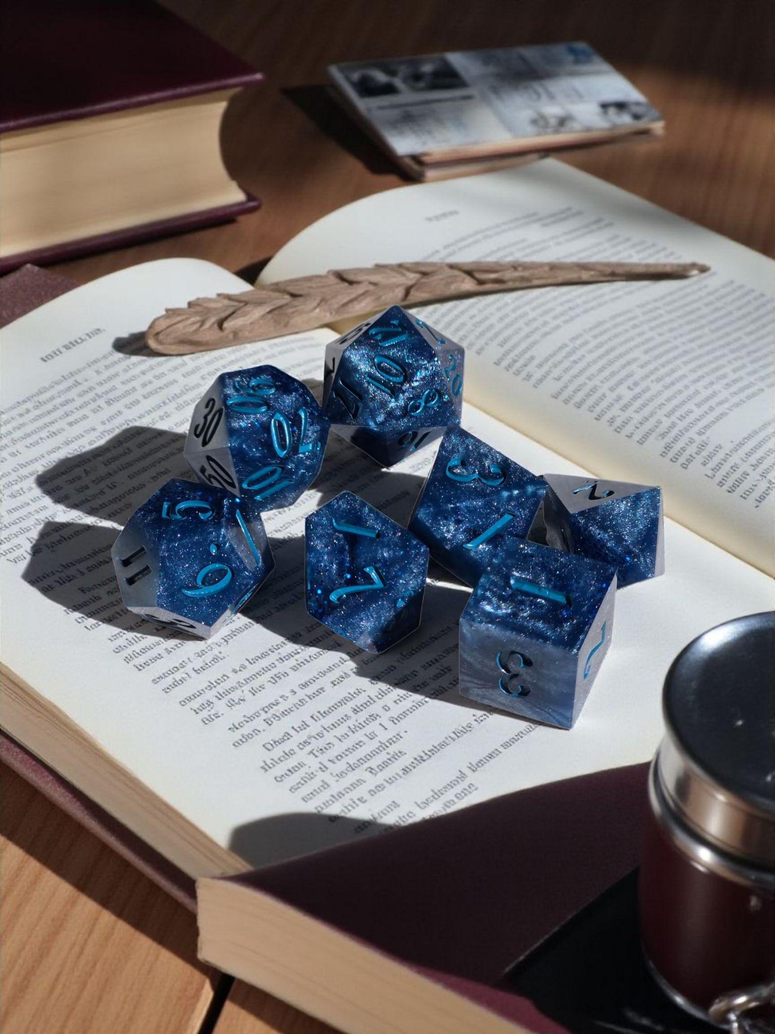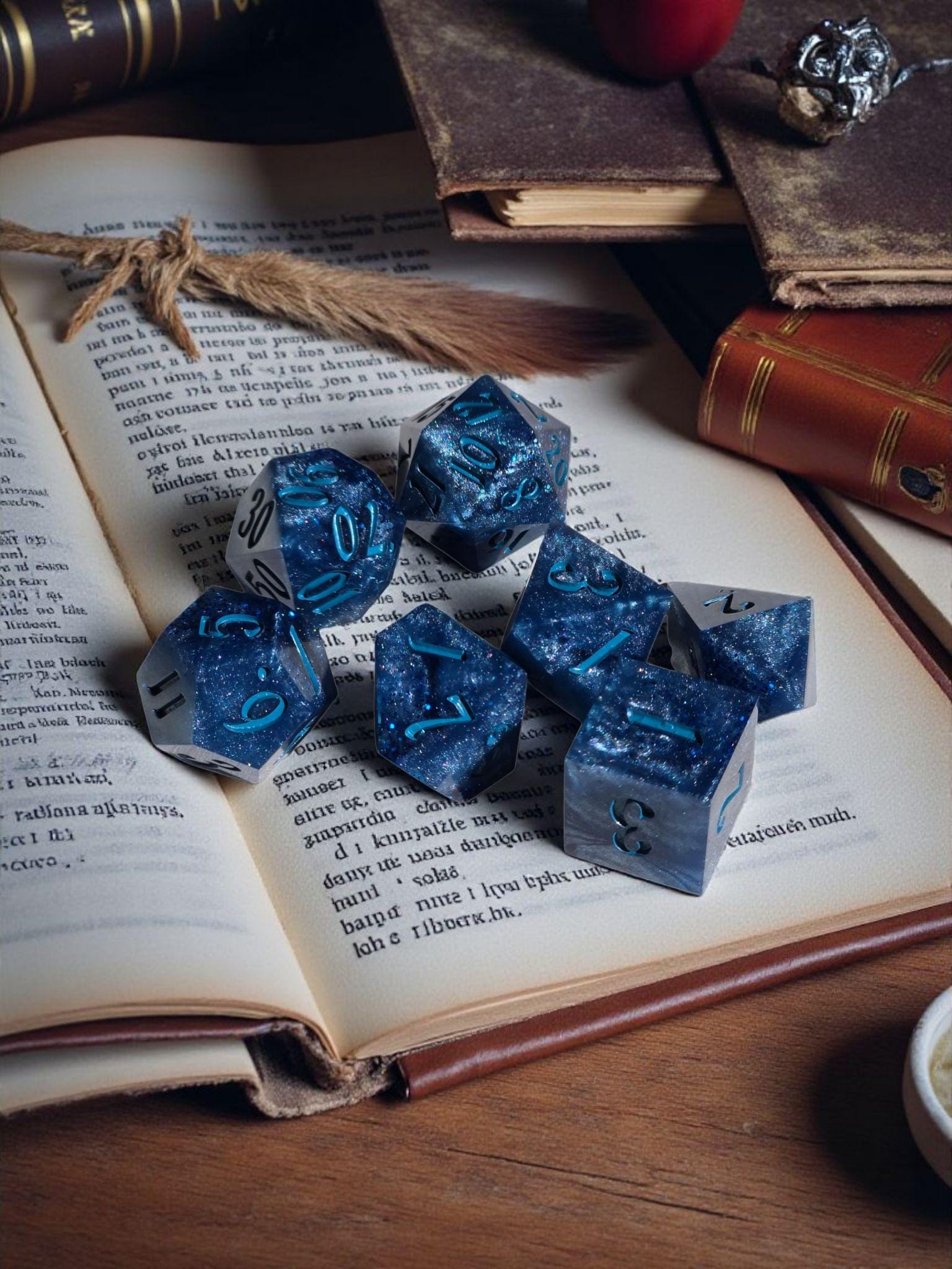 These dice are said to descend from the relics of a long-fallen lunar court, where spellcasters once bound moonlight into glass and used it to divine the will of the stars. When held to the light, their depths shimmer like distant constellations glimpsed through ancient palace windows.