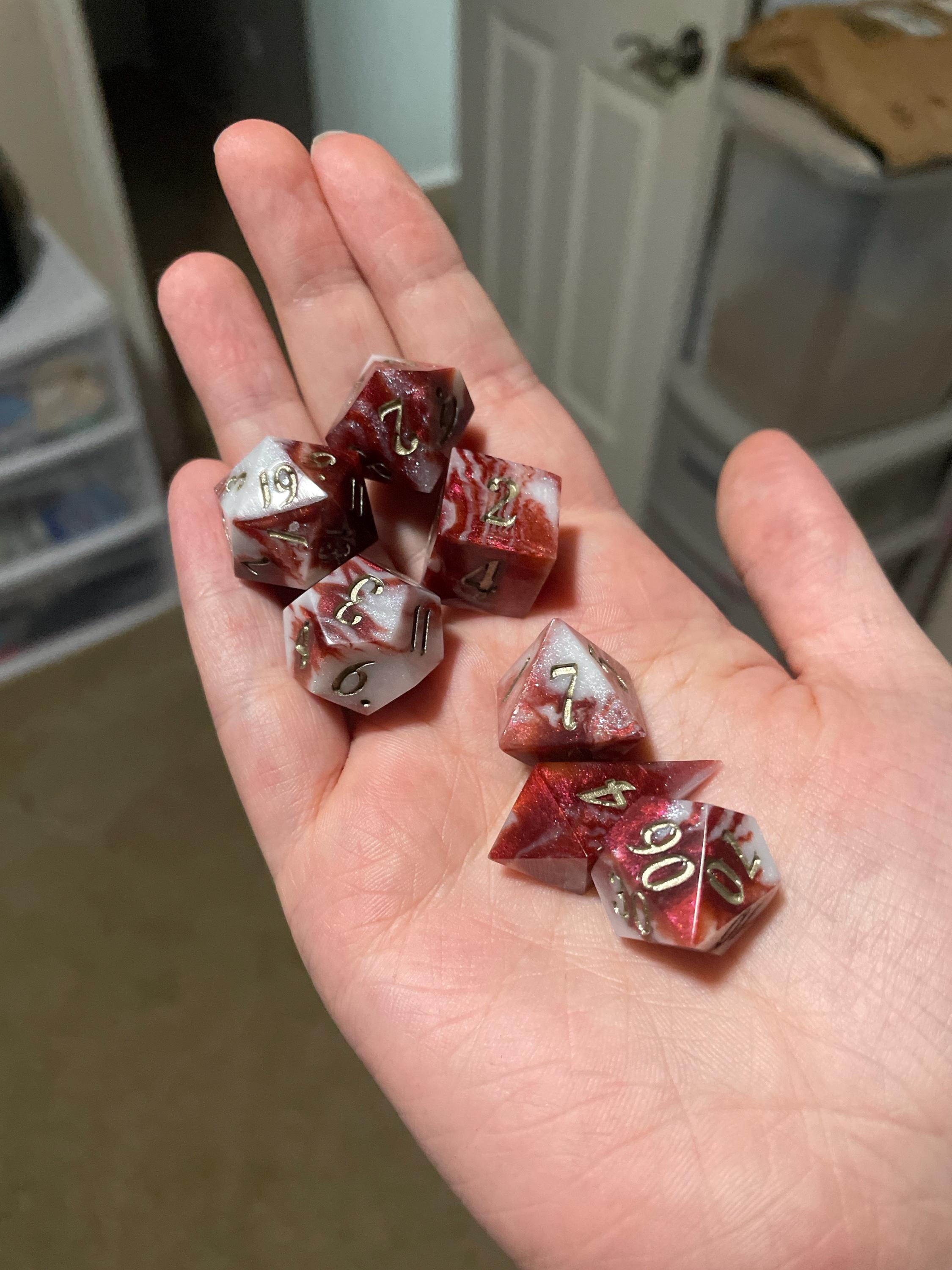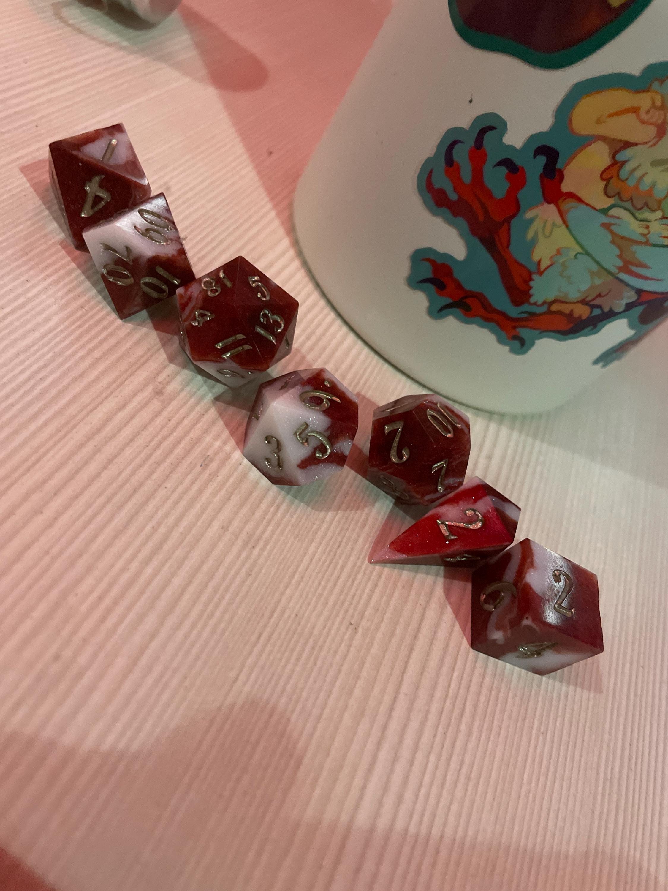 Swirls of pure white entwined with deep crimson, forming patterns as striking as veins through carved stone. Elegant yet haunting, these dice evoke the image of sacred relics etched in blood and ivory. A perfect set for those whose fate is written in both grace and sacrifice.
