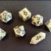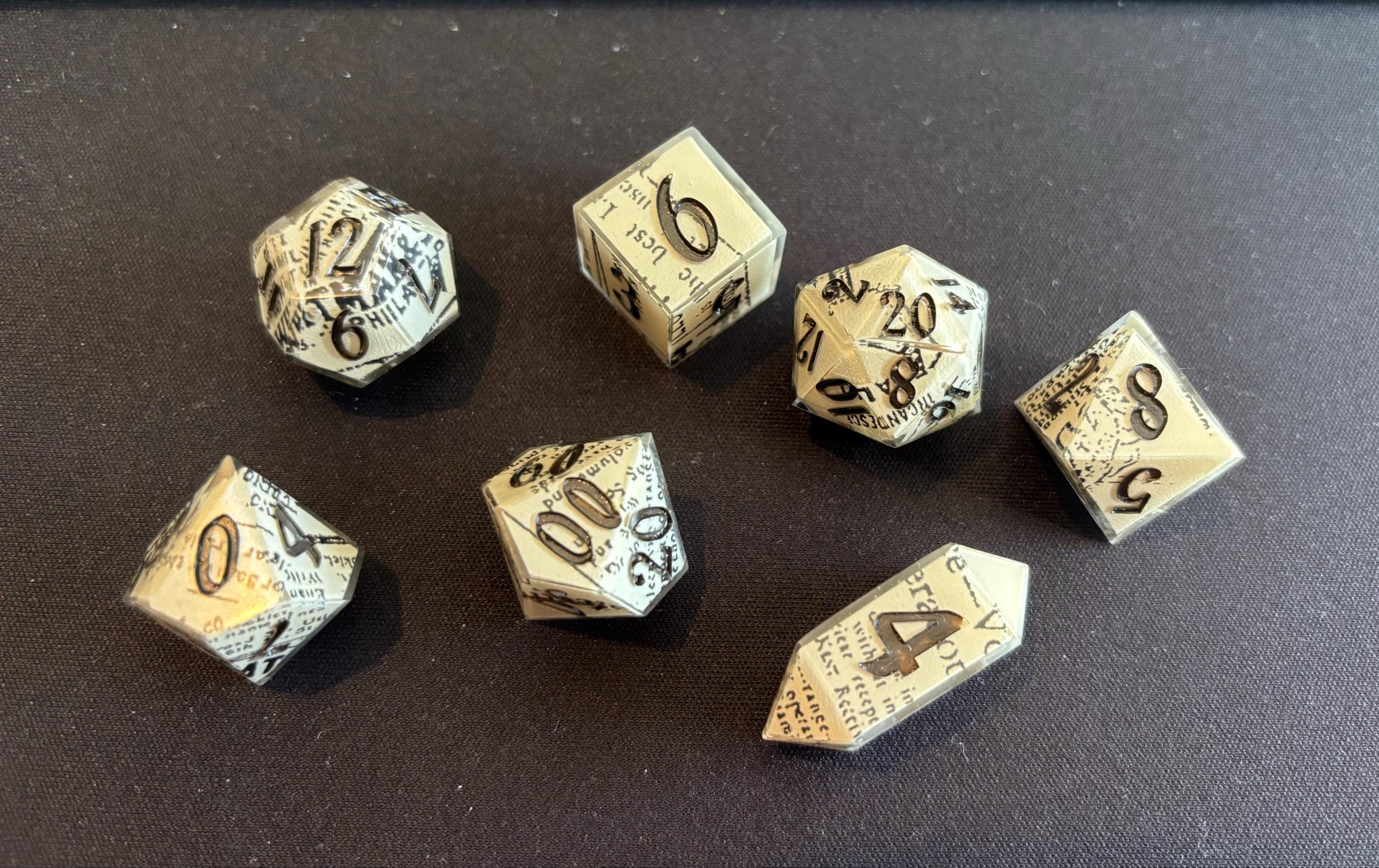 These dice look as though they were crafted from the torn pages of an ancient tome. Clear resin reveals clippings of letters and numbers, while bittersweet brown paint marks each face like ink aged by time.