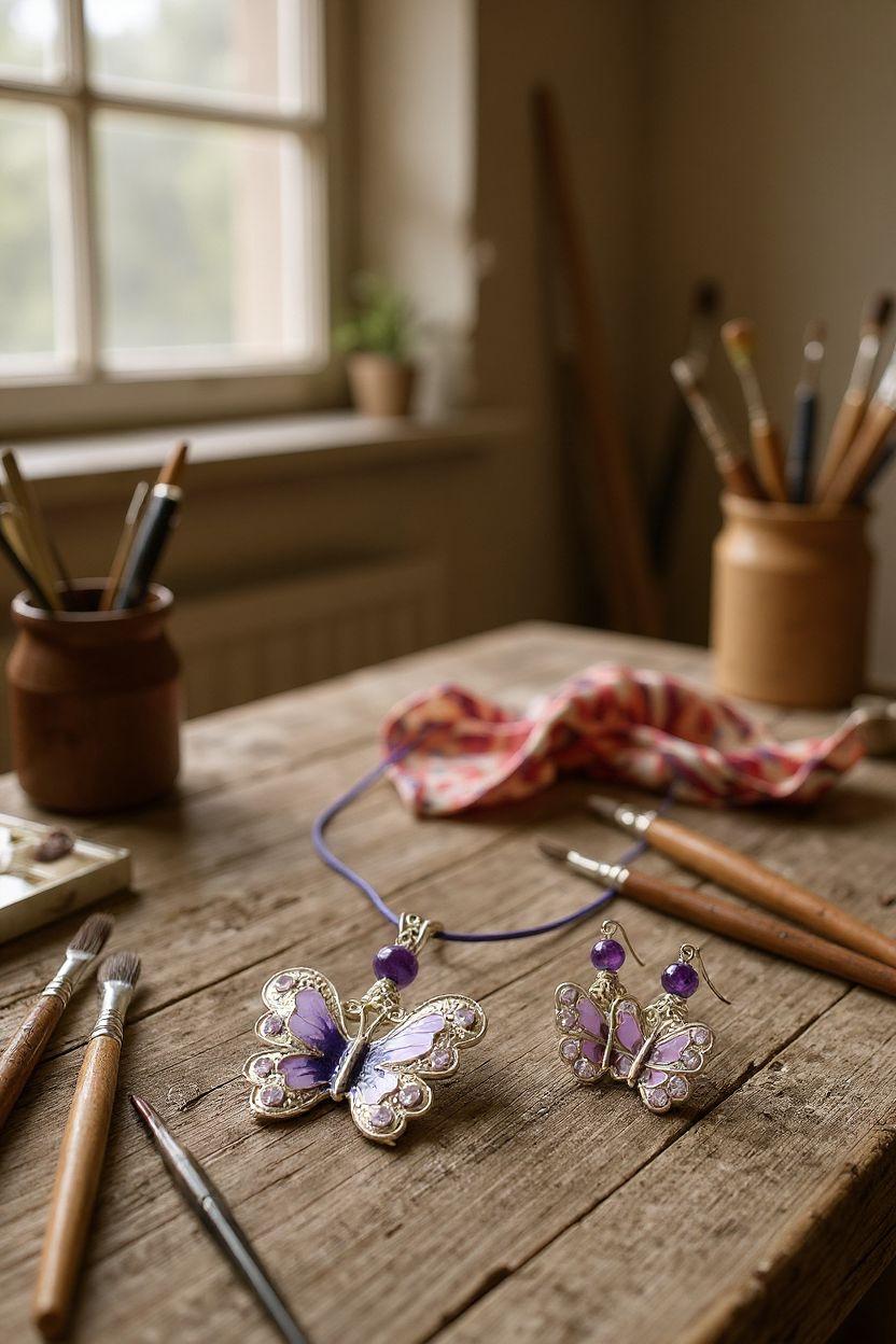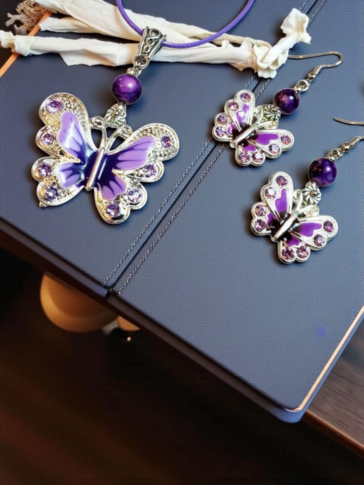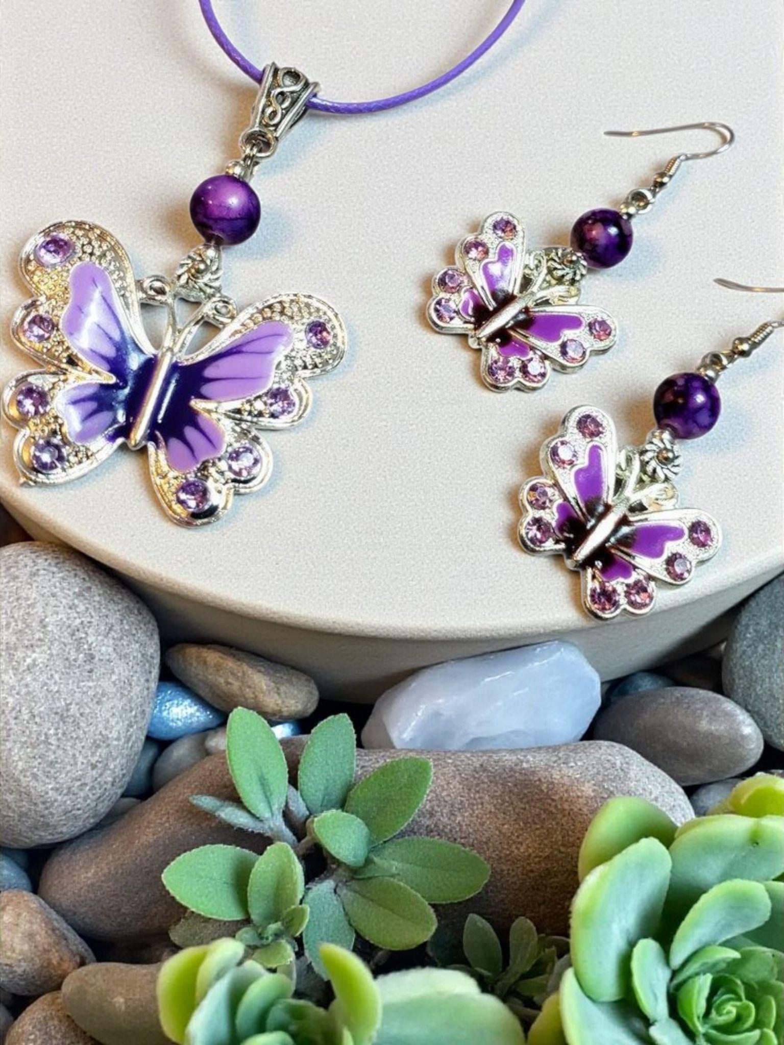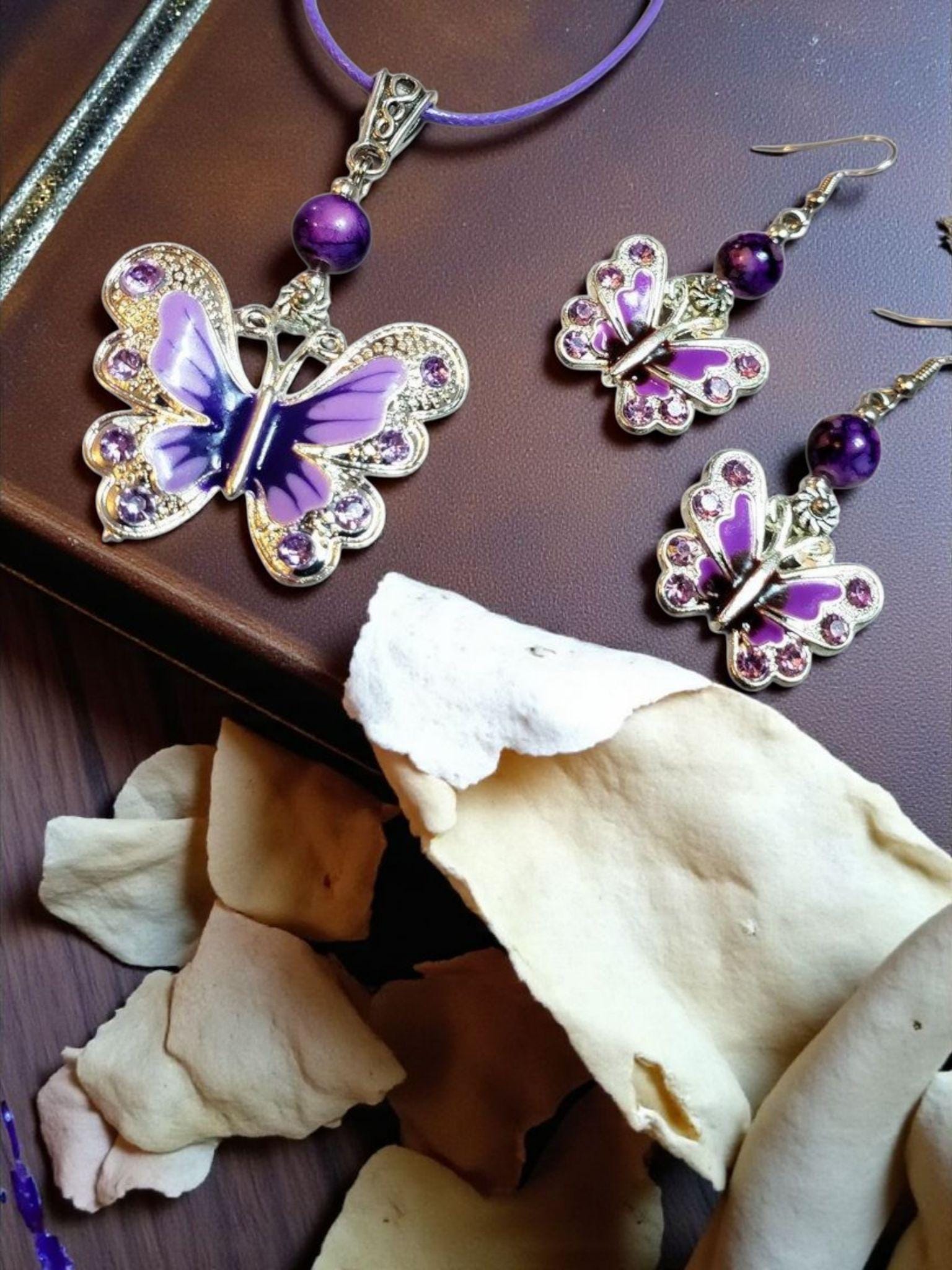 These jewelry sets are very striking in color. They are just beautiful. I have added the rhinestones, beads, ear wires, and necklaces ropes. The list price is for 1 necklace and 1 matching pair of earrings. These are one of a kind sets. What is pictured is what you will get. I am very limited on materials to make these, so no two sets will be the same.
