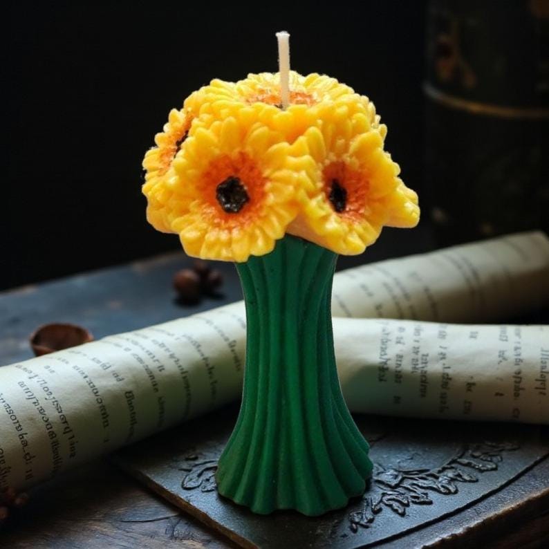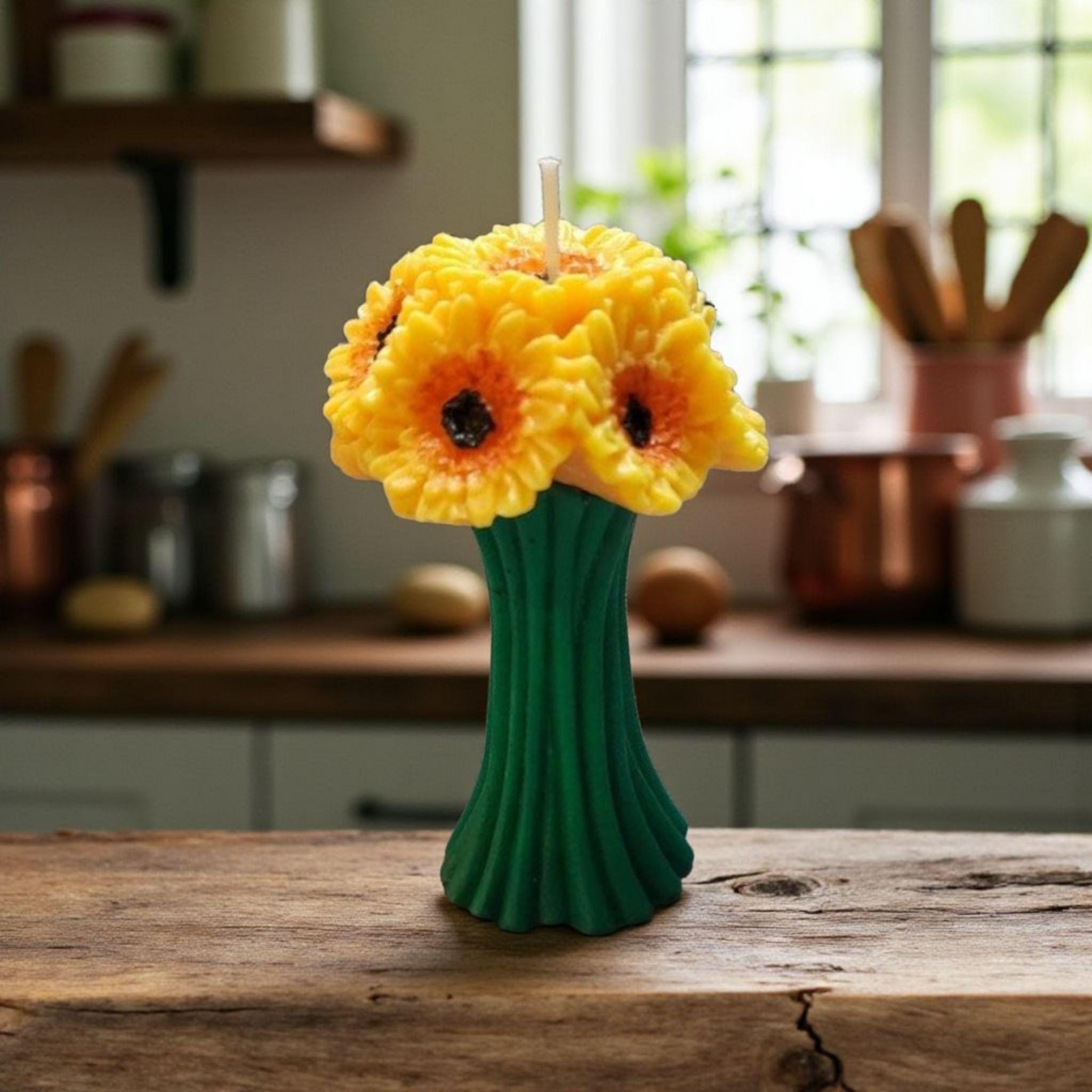 By request, i was asked to provide a larger sunflower candle. So here it is, this is a beautiful bouquet of sunflowers. It is made from a soy/paraffin mix. Hand painted with a water-based acrylic paint. It is sealed with a water-based sealer. The list price is for 2 candles. Each candle will measure 5" tall x 3"wide.
